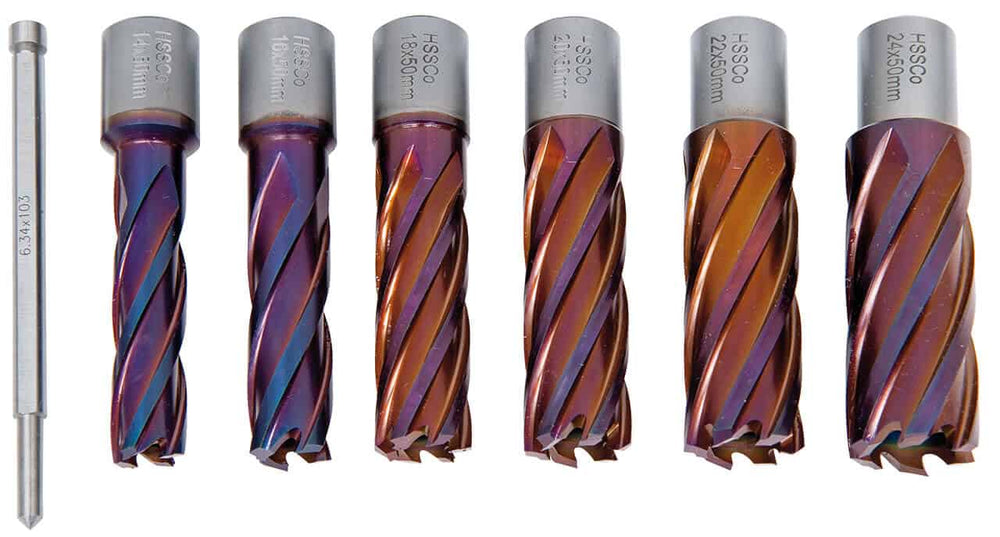 HSSCO5 CDL Kernbohrersatz, nACO-beschichtet, 14 - 24 mm, Bohrtiefe 50 mm