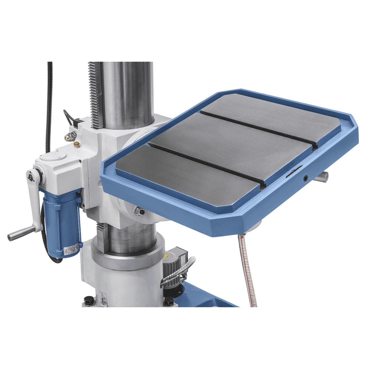 Ja, der Gusseisentisch ist um 360° drehbar, von -45° bis +45° neigbar und verfügt über eine elektrische Höhenverstellung.