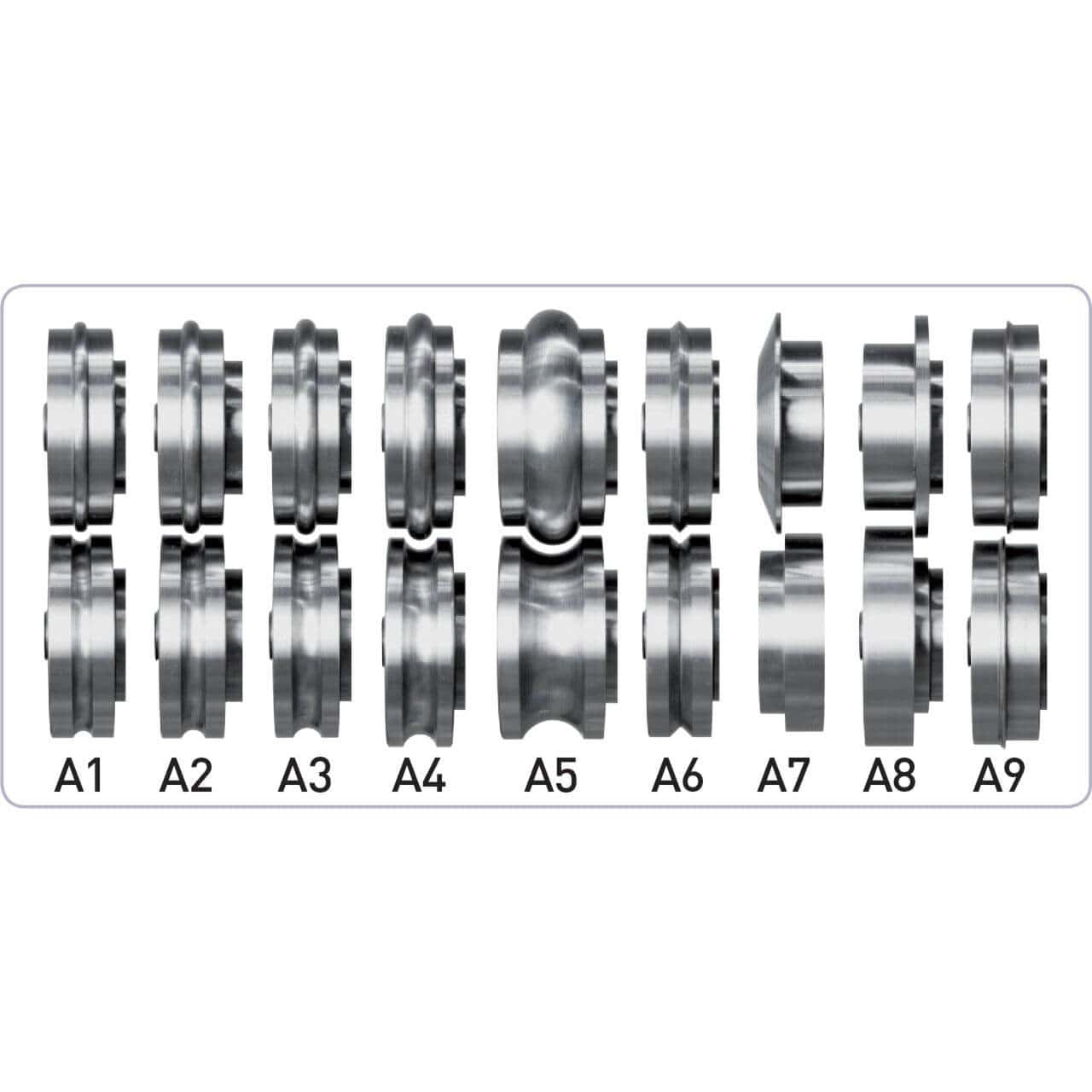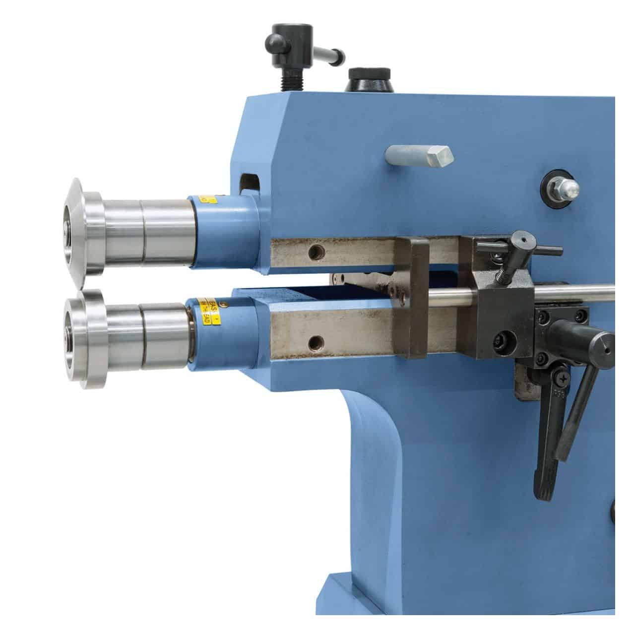 La macchina è fornita con rulli speciali tipo A2, pedale di comando, arresto pezzo regolabile e chiave per rulli.