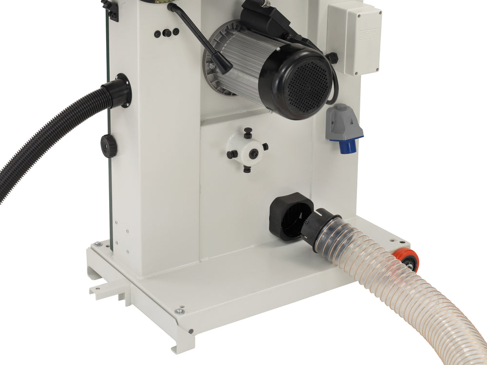 Il piano in ghisa con prolunga laterale offre una superficie di appoggio ampia e rigida, mentre il motore da 2,0 kW monofase o 1,9 kW trifase garantisce potenza costante per tagli diritti, curvi e produzione di lamelle (veneer).