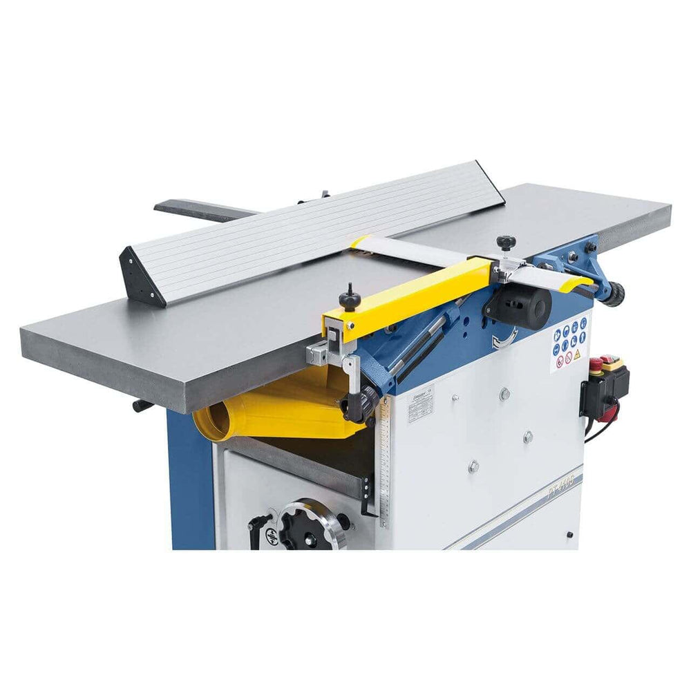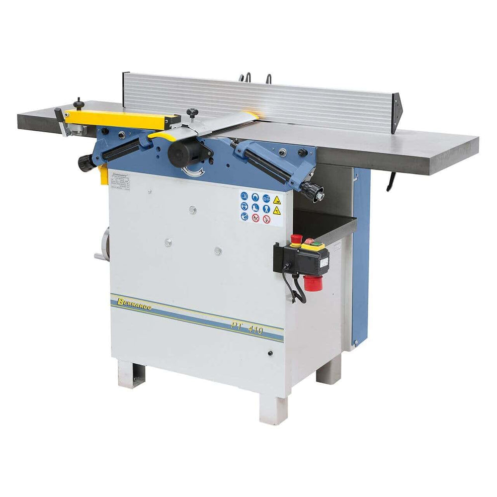 La pialla a filo e spessore Bernardo PT 410 è una macchina professionale ad alte prestazioni, progettata per falegnamerie e laboratori artigianali che richiedono massima precisione e durata. Dotata di tavoli in ghisa indeformabili da 1600 mm e larghezza di piallatura di 410 mm, offre risultati impeccabili anche su tavole e travi di grandi dimensioni. L’albero pialla a 4 coltelli HSS assicura una superficie perfettamente liscia, mentre il piano a spessore con colonna centrale garantisce planarità costante e regolazioni precise. I tavoli inclinabili permettono una rapida conversione da pialla a filo a spessore, e la recinzione con guida prismatica assicura stabilità e precisione anche nei tagli angolari. Con un motore da 3,0 kW (4 HP) e un sistema frenante integrato, la PT 410 unisce potenza, sicurezza e comfort d’uso, rendendola ideale per lavorazioni professionali di alta qualità.