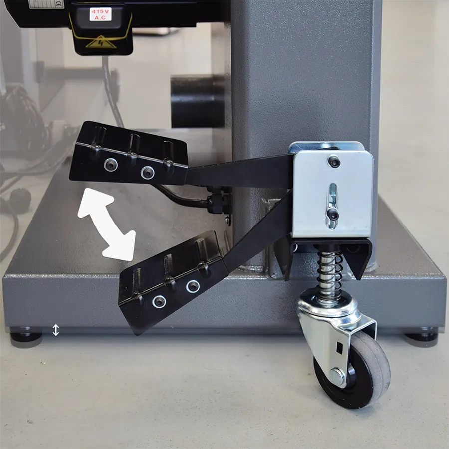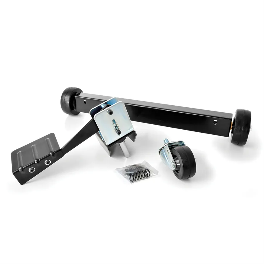 Il kit è composto da due ruote fisse per garantire stabilità durante il posizionamento e da una ruota girevole, che consente di ruotare e orientare la macchina con estrema precisione. Il meccanismo include un pedale integrato per attivare o disattivare la modalità di trasporto, assicurando che la macchina rimanga perfettamente ferma quando in uso.