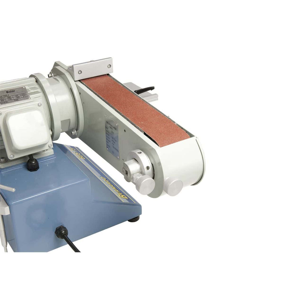 La Levigatrice a nastro Bernardo BDS 75 è una macchina compatta e versatile, ideale per levigature di superfici, contorni e profili su metalli e altri materiali. Grazie alla combinazione di nastro abrasivo da 75 x 1180 mm e disco abrasivo Ø 150 mm con fissaggio a velcro, consente un’ampia gamma di applicazioni: sbavatura, lucidatura di saldature, levigatura cilindrica e finiture di precisione. La macchina è dotata di rivestimento in grafite sulla superficie frontale per aumentare la scorrevolezza del nastro, di tavoli di lavoro inclinabili (0–90° per il nastro e 0–45° per il disco) e di un sistema di aspirazione integrato Ø 50 mm. Con motore da 1,1 kW (S1) e 1,5 kW (S6), garantisce prestazioni elevate e funzionamento costante. La struttura robusta e priva di torsioni assicura stabilità, precisione e lunga durata operativa.