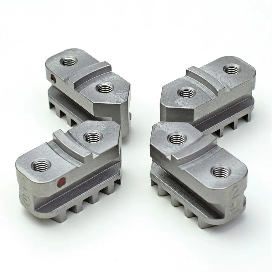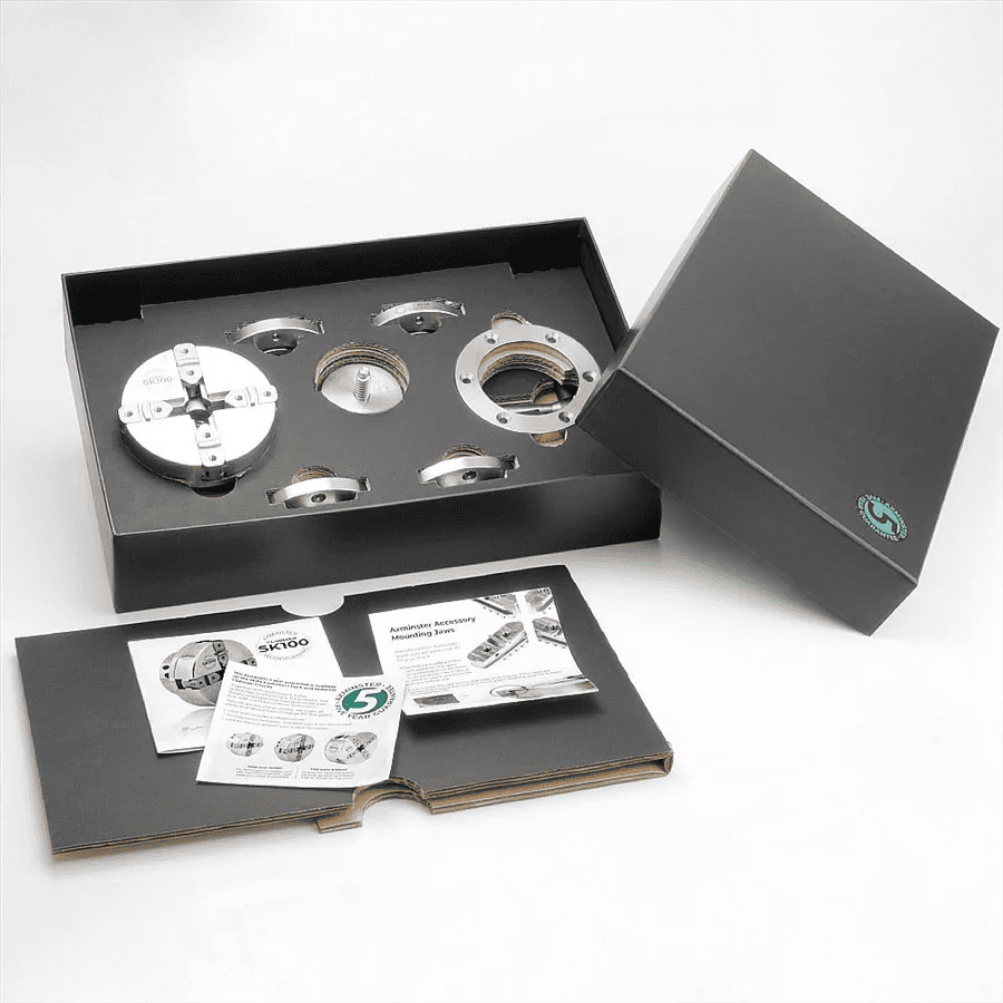 Il kit comprende un set di ganasce a coda di rondine, estremamente intuitive nell'uso, che possono alloggiare sia l'anello di fissaggio per piatto che il mandrino a vite. Queste ganasce offrono una capacità di montaggio di 69 mm in apertura e 56 mm in chiusura, adattandosi a vari diametri di lavorazione.