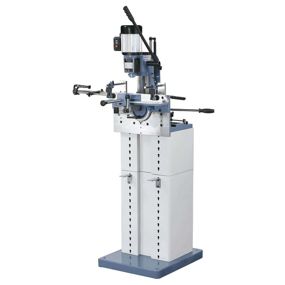 Sono inclusi mandrino da 16 mm, scalpello da 15,87 mm, morsa rapida, bloccaggi eccentrici, guida longitudinale, cilindro a gas, tavolo inclinabile e vano porta utensili.