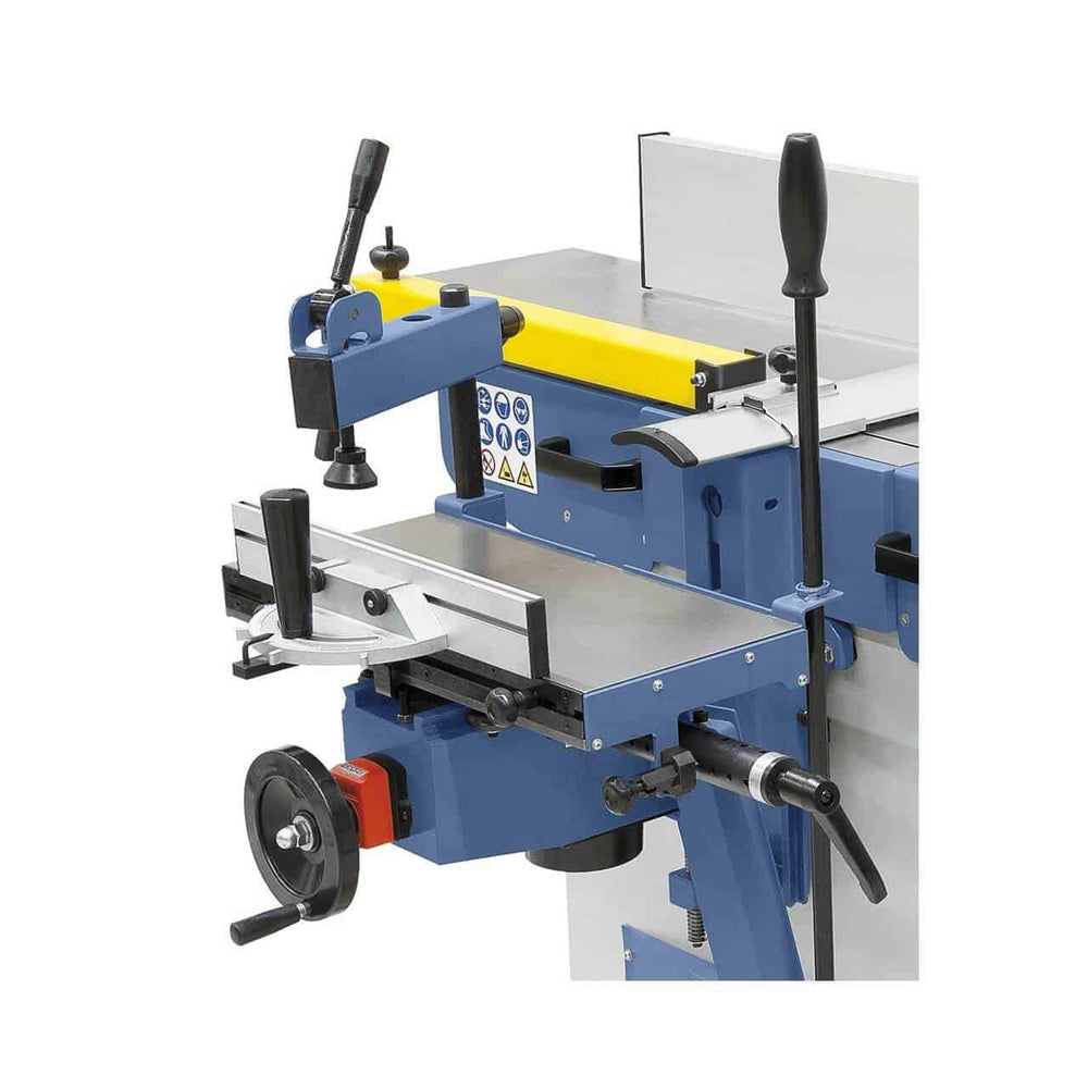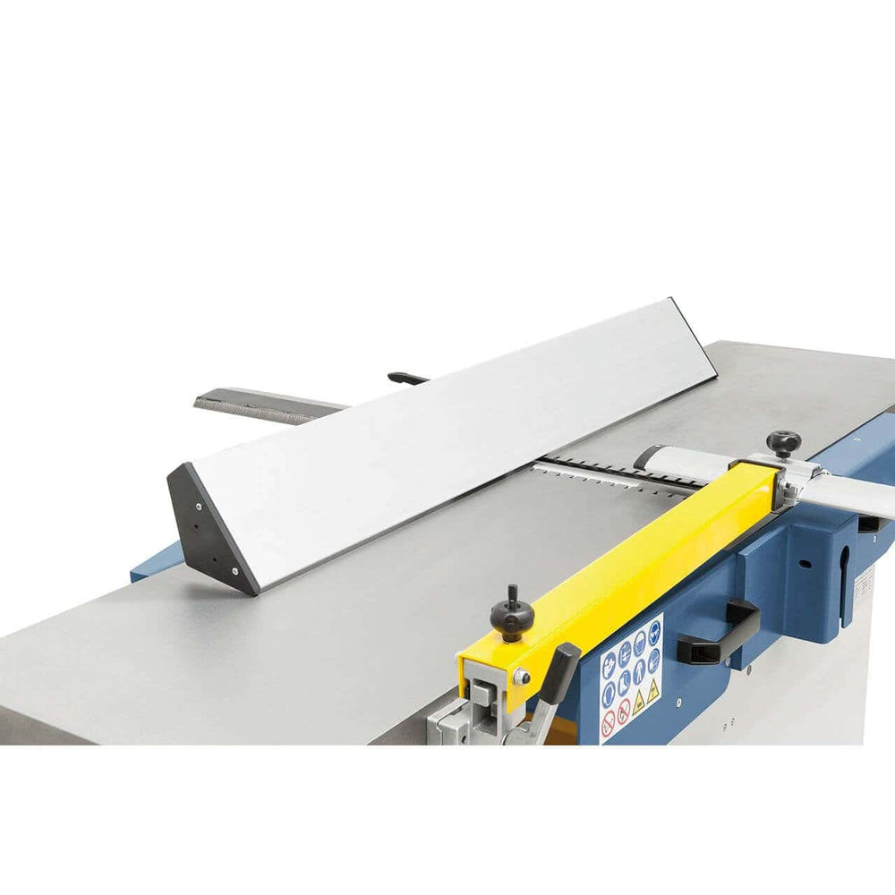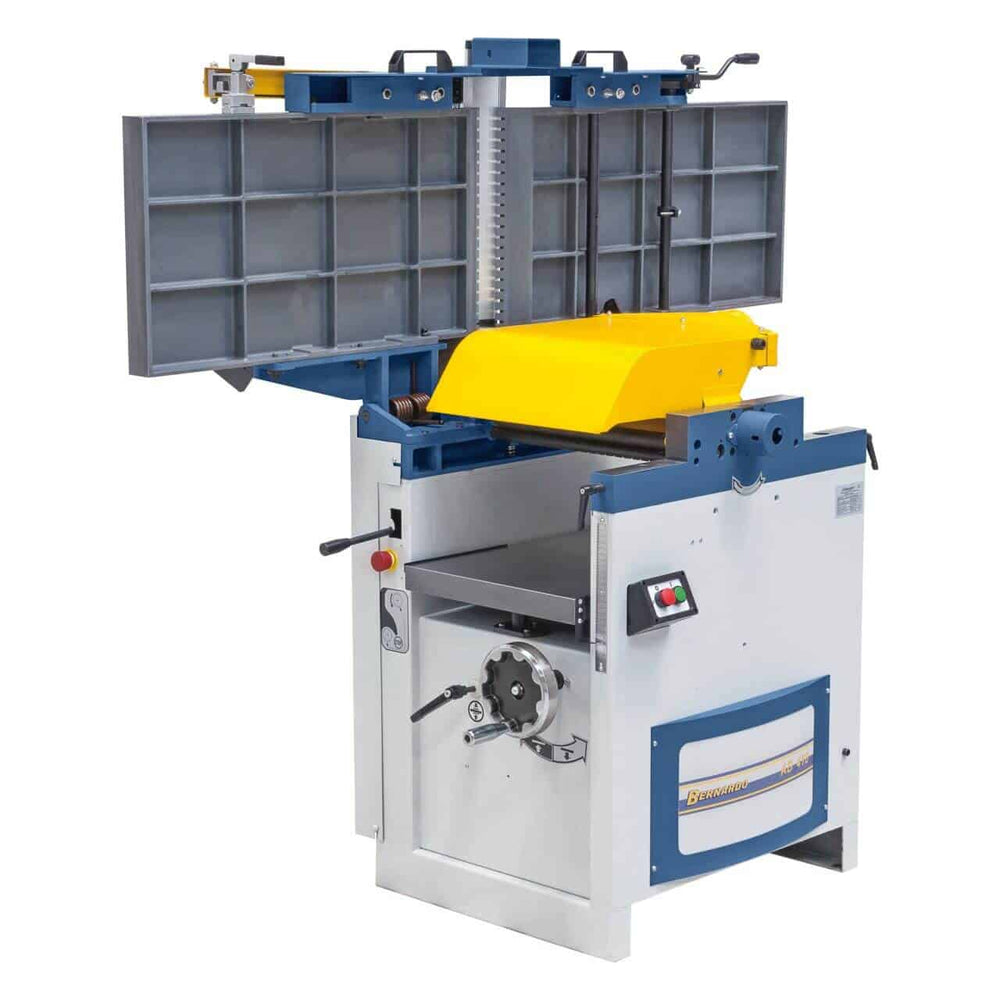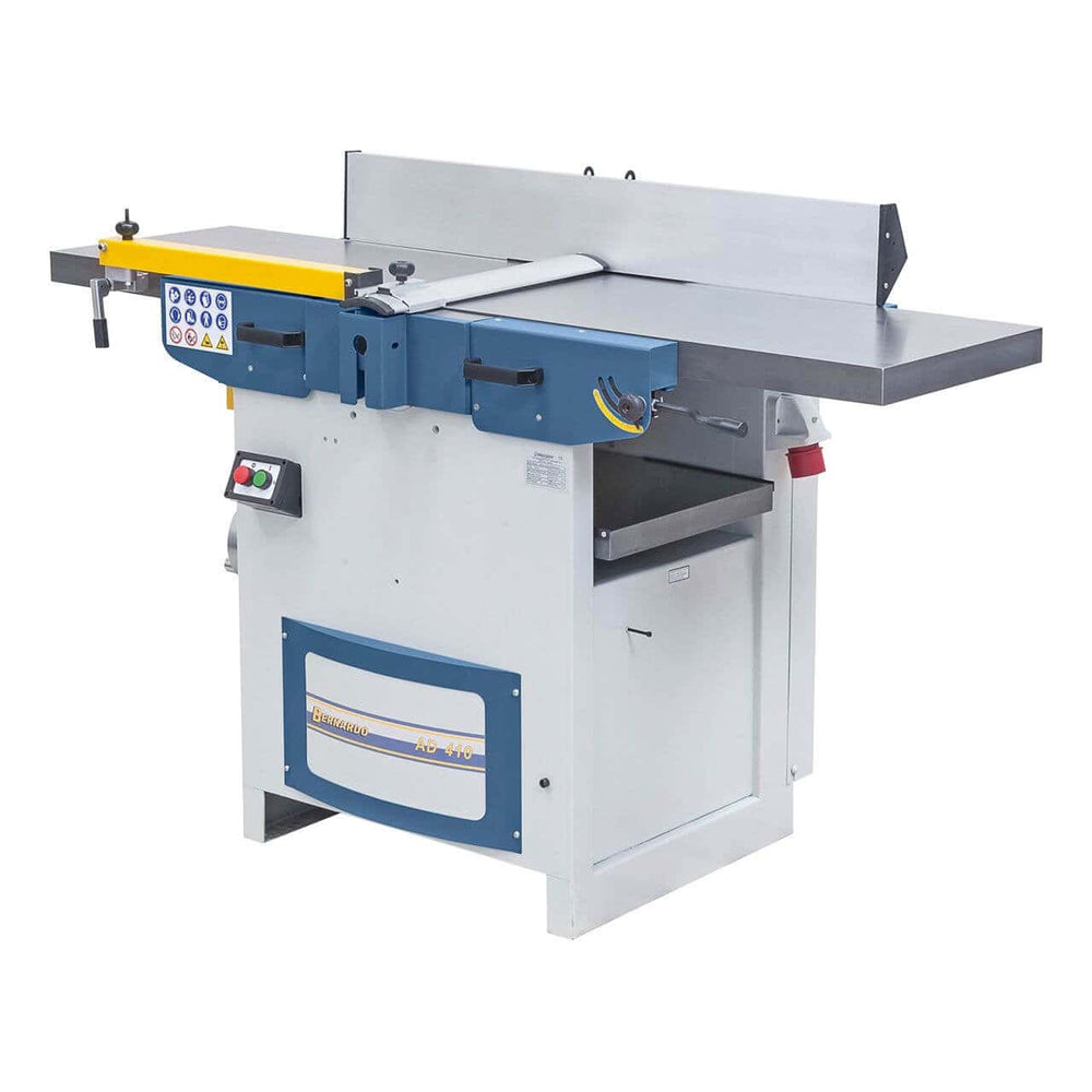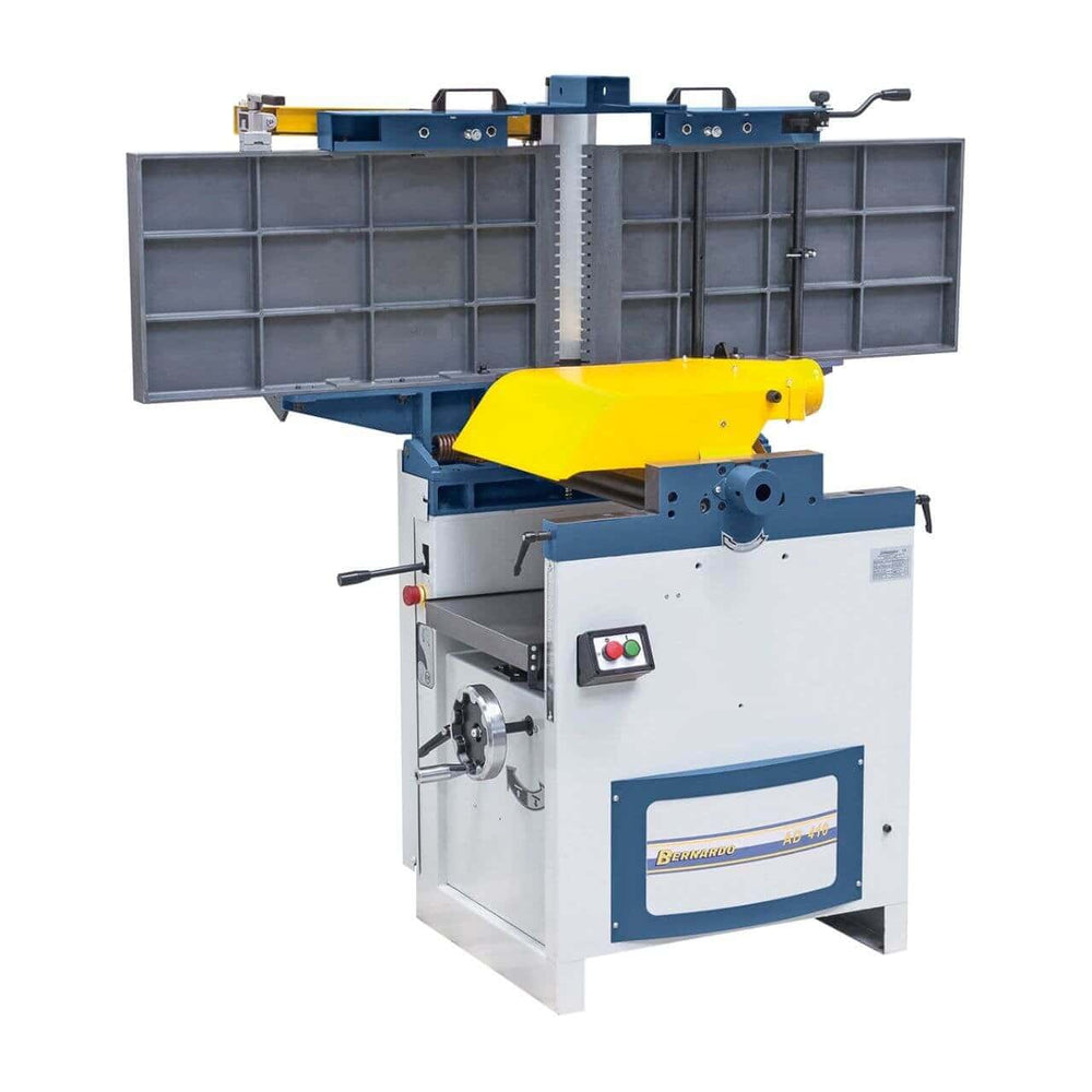 La pialla a filo e spessore Bernardo AD 410 – 400V è una macchina professionale per falegnamerie e laboratori che necessitano di precisione, potenza e robustezza. Con una larghezza di piallatura di 410 mm e un tavolo lungo 1685 mm, assicura superfici planari di alta qualità. L’albero pialla da 95 mm con 4 coltelli HSS lavora a 4300 giri/min, garantendo finiture lisce anche su legno duro. La piallatrice a spessore permette passaggi da 4 a 220 mm con profondità di truciolo fino a 5 mm e avanzamento costante di 6 m/min. Il potente motore trifase da 3,0 kW (4,2 kW S6) assicura prestazioni elevate e continue. Con un peso di 340 kg, la struttura stabile riduce vibrazioni e aumenta la precisione di lavoro. Una soluzione ideale per falegnami esigenti e officine professionali.