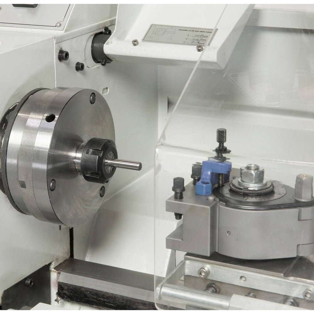Protezione mandrino, copertura guida, parete posteriore truciolo e indicatori digitali per monitorare velocità e giri.