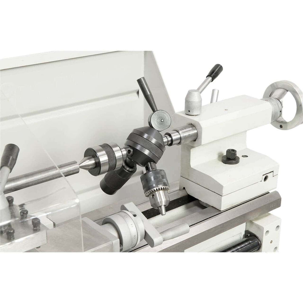 Occorre fissarla al piano/stand, montare protezioni, volante contropunta e accessori (mandrino 3 griffe, flangia 160 mm, mandrino trapano B16, ecc.).