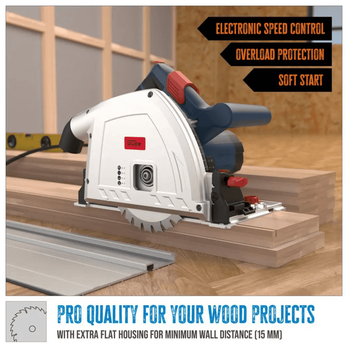 La Guede TS 57-1400 KE Set è una sega a immersione professionale da 1400 W, progettata per tagli precisi e puliti su legno, pannelli e materiali compositi. Grazie alla regolazione elettronica della velocità, al soft start e alla protezione da sovraccarico, garantisce un controllo totale e una lunga durata del motore. Il design compatto con corpo piatto (solo 15 mm di distanza dalla parete) consente tagli vicino ai bordi, mentre il sistema di immersione parallela assicura tagli accurati fino a 57 mm di profondità.