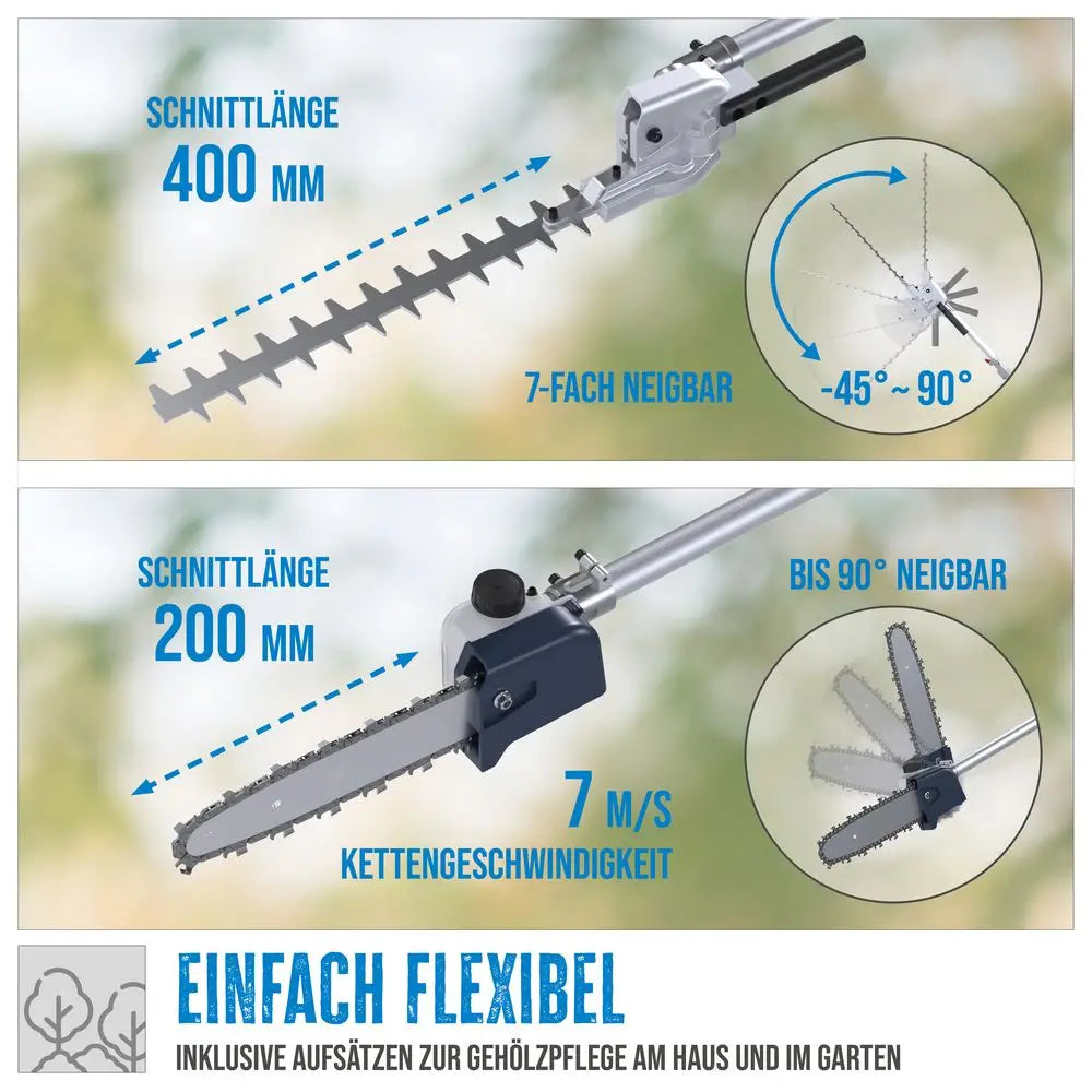 • Sistema multifunzione 4 in 1: decespugliatore, tagliabordi, tagliasiepi e motosega per rami